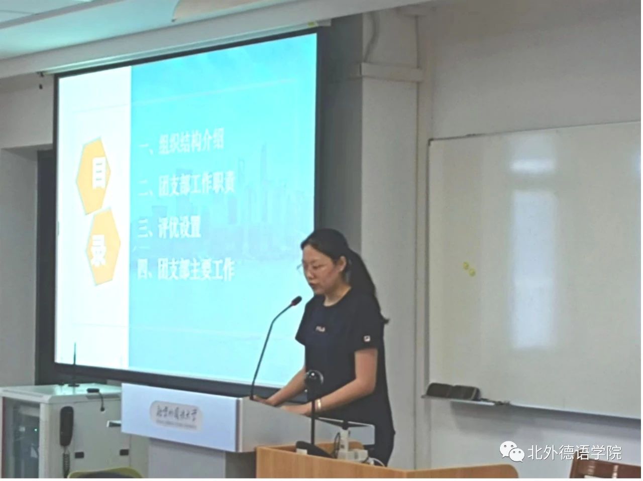 9月6日下午,在逸夫楼213教室,德语学院党总支委员、副院长张晓玲为全体硕博新生介绍了德语学院硕博学生的培养学制、学分要求、出国、实习以及请假和考勤等情况。研究生教研室主任陆娇娇介绍了出国奖学金的申请途径与步骤。党总支常务副书记李勇给予了提高安全防范意识,规划好研究生学习和生活方面的建议。