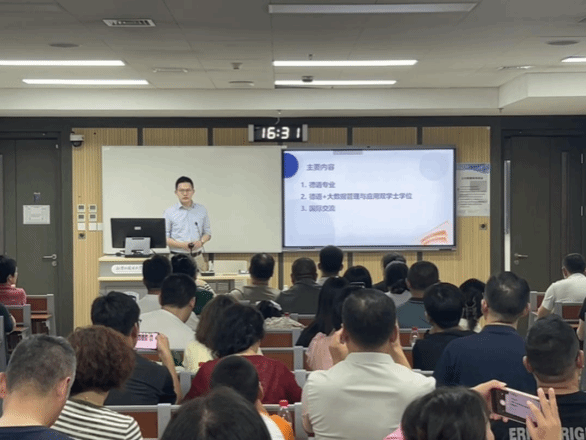 随后,德语学院党总支委员、副院长寇蔻聚焦本科人才培养,为家长们详细解读本科专业人才培养方案。他指出,学院正积极推动数智赋能本科教学,以科技助力教学质量提升。并围绕本科课程体系,分别介绍基础阶段的知识夯实重点与高年级阶段的课程设置,强调高年级选课体系“动态多元”的特点,满足学生个性化发展需求。寇蔻副院长还提及北外德语专业本科基础阶段教学改革成果,重点介绍《新经典德语》教材的应用——通过教材内容设计,引导学生用德语讲好中国故事,推动中外文明互鉴;同时梳理学院重要考试安排、各类赛事资源及选拔机制,为家长清晰呈现学生成长路径。此外,针对今年第一年招生的 “德语+大数据管理与应用” 双学士学位项目展开说明,从思政育人、课程育人、实践育人三个维度,介绍该项目的德语课程、大数据管理与应用课程及交叉融合课程设置;并围绕国际化人才培养,列举交流学习项目、海外实习实践机会、国外专家讲学讲座及高水平国际交流活动,展现学院为学生搭建的国际化成长平台。