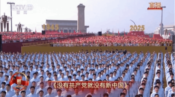 9月3日天安门广场上,三千名首都高校大学生组成的合唱团齐声高歌,演绎了《松花江上》、《在太行山上》、《保卫黄河》、《没有共产党就没有新中国》等歌曲,拉开了纪念中国人民抗日战争暨世界反法西斯战争胜利80周年大会暖场环节奏唱抗战曲目的序幕。