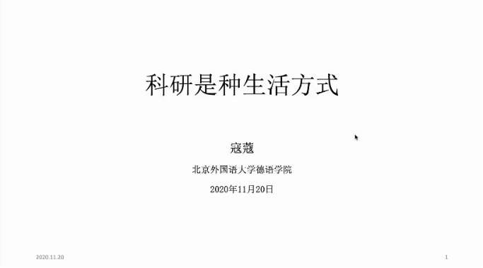 2020年11月20日,德语学院“学术漫步”系列讲座第一场在腾讯会议平台顺利举行。德语学院德国外交与经济方向的寇蔻老师受邀与大家分享了自己的学术科研经历,从经济学领域出发,介绍了选题、阅读文献、论文写作与投稿等方面的经验,分享了科研故事以及对大家的建议,并解答了同学们提出的相关问题。讲座由德语学院研究生会主办,研究生会张砚池主持。20点,讲座正式开始。
