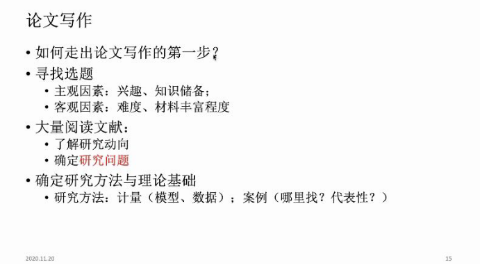 首先,在“选题”部分,寇蔻老师介绍了经济学研究的分类,建议大家从文献、时事以及同他人的交流中获取选题灵感,还从为什么要读文献以及如何读文献两方面介绍了“阅读文献”这一科研人必备技能。