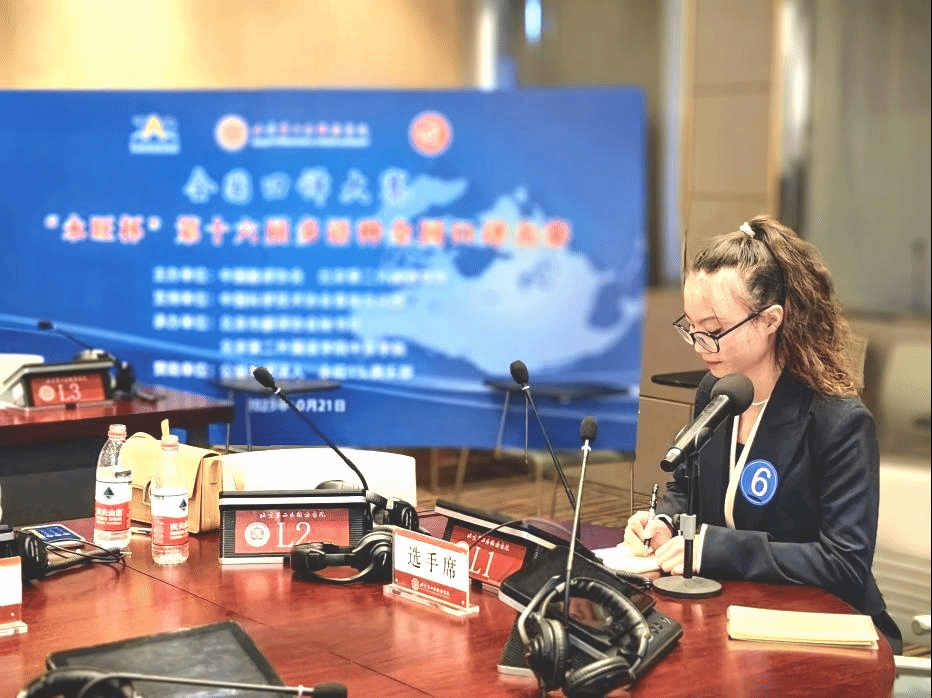 德语学院翻译硕士(德语口译)专业2023级学生艾丽娜代表北京外国语大学参赛,在复赛和决赛中均取得了第一名的成绩,最终在决赛中获得德语交传组一等奖。本次参加德语组复赛的共有全国十所高校的选手来自北京大学、中国人民大学、对外经济贸易大学、上海外国语大学、北京第二外国语学院及我校的选手最终进入德语交传组决赛。此次参赛由我院教师冷慧博士指导带队。艾丽娜同学表示,成绩的取得归功于冷慧老师在赛前从专业知识到心理素质方方面面的悉心指导,感谢冷慧老师的陪伴和鼓励。