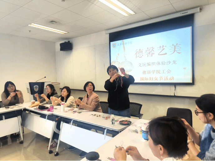 为庆祝第115个“三八”国际劳动妇女节,传承中华文化,陶冶师生情操,丰富美育内涵,德语学院工会组织“德馨艺美”文玩编织沙龙,邀请宣传部王欣老师教授师生学习中国传统文玩编织技艺,近30名师生参加了活动。